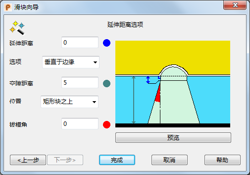 预览 - 使用对话框中的值在模型窗口中显示抽芯机构。如有必要,请更改值,然后再次单击“预览”。
