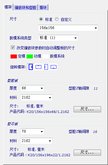 型腔/型芯板块 - 选择型腔/型芯板块的“厚度”和“材料”。型腔的 Z 间隙在右侧指定。