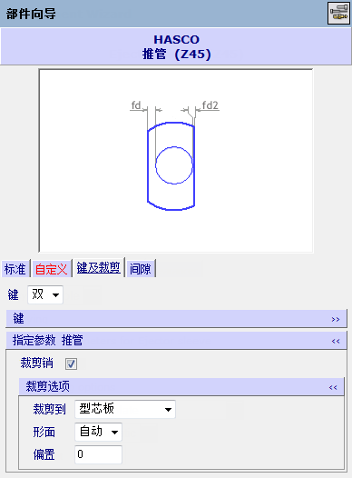 “键和修剪”选项卡会显示适用于普通孔、阶梯、叶片推杆和司筒的单槽或双槽关键杆的参数。显示的参数特定于要创建的部件的类型。