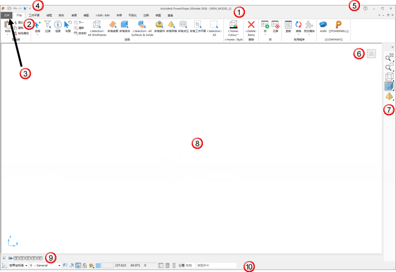 PowerShape 使用 Windows 式界面,其中包含带有选项卡的功能区。屏幕区域标识如下: