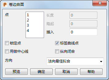 预览 - 此选项可使用给定的参数显示曲面。如果生成的曲面不正确,请更改参数并再次单击“预览”。位于点 1 处的标记可用于反转隆起的方向。