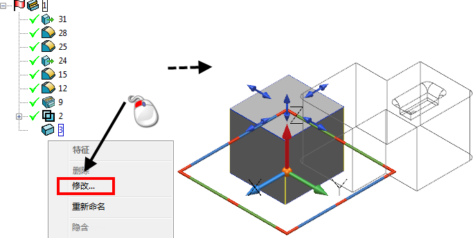- 如果“编辑变换位置特征”处于取消选择状态,则先在其位置编辑该特征,然后再应用变换。因此,如果移动布尔矩形块,则在其原始位置编辑该矩形块。