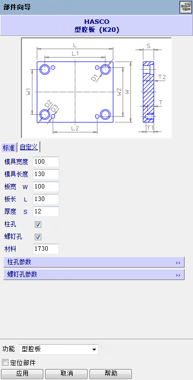 可以使用“板块宽度”、“板块长度”和“厚度”等选项更改尺寸。在“自定义”选项卡中显示的确切参数反映了要定义的部件的类型。