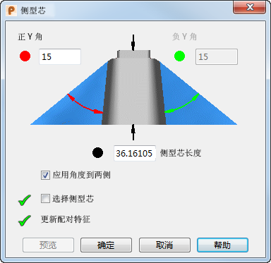 在特征上单击鼠标右键,然后从关联菜单中选择“修改”以显示“侧型芯”对话框: