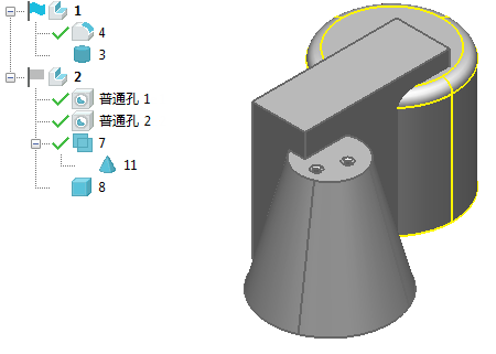 分离操作使用复制的历史树(外加顶级布尔特征)生成未连接的实体。下面的示例显示了两个实体: