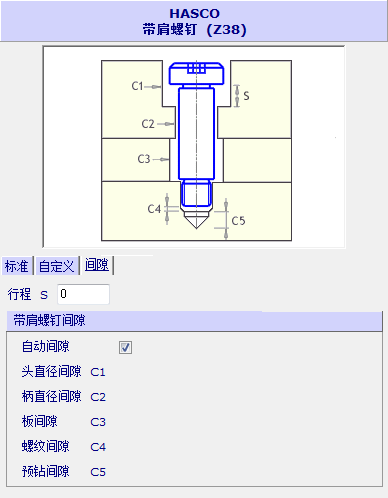 “间隙”选项卡显示了诸如导柱、推杆、螺钉、浇口套、支承柱和定位销等部件所需的参数。显示的参数特定于要创建的部件的类型。