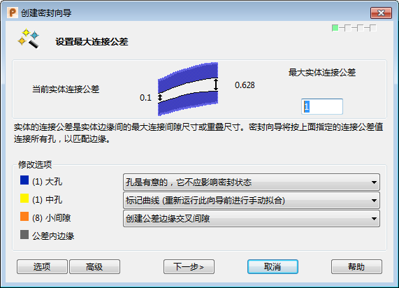 下一步 - 如果选择该选项,且实体无间隙,将显示“愈合实体中已有的曲面连接”页面。在所有其它情况下,“预览实体状态”页面将显示实体摘要。