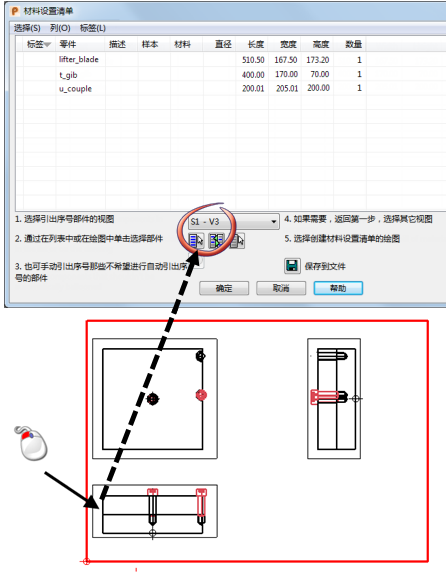 “材料设置清单”对话框的下半部分包含对绘图包含的材料设置清单所选部件应用引出序号和标签的相关说明和选项。