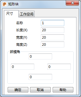 使用“尺寸”选项卡编辑标准体素的尺寸。可编辑的尺寸因所选的标准体素类型而异。例如,下图所示的对话框用于标准体素矩形块: