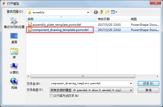 1. 单击“文件”>“打开”>“模型”。从列表中,选择部件绘图模板文件并单击“打开”。