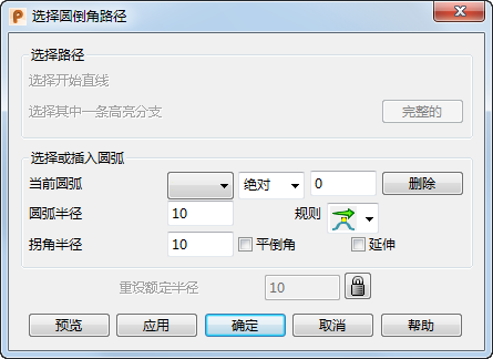 路径完成后,“选择圆倒角路径”对话框将高亮显示圆倒角圆弧编辑功能。