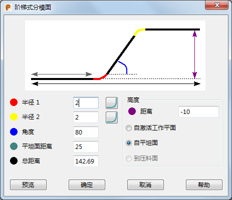 - 创建一个或两个阶梯式分模面。选择此按钮后,将显示“阶梯式分模面”对话框(针对型芯的“型芯阶梯式分模面”或针对型腔的“型腔阶梯式分模面”)。