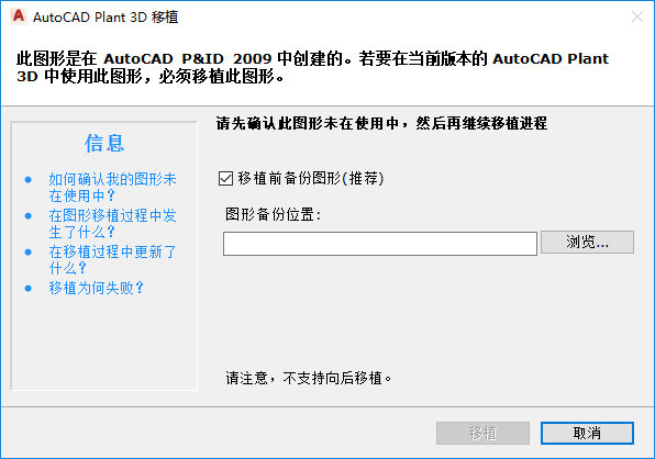 建议备份图形,以防需要在 AutoCAD P&ID 2011 中进一步处理。