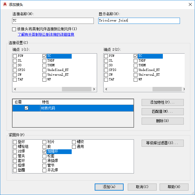 如果您还希望支持单位相同的元件之间的连接,请使用“添加接头”对话框添加另一个具有类似特性的接头(例如:添加类似于 Buttweld 的 MixedButtweld)。