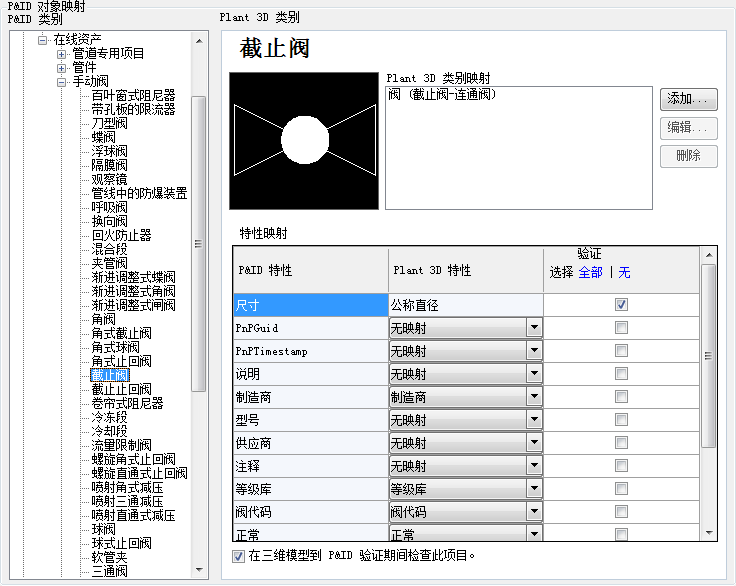 - 在“Plant 3D 类别”下,展开树。单击某个类别(例如:“阀”)。