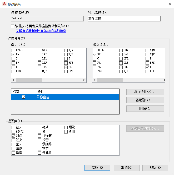 支持英制到公制连接的连接类型不同于单位相同的连接类型。这允许用户指定匹配特性,如 150#、10PN。