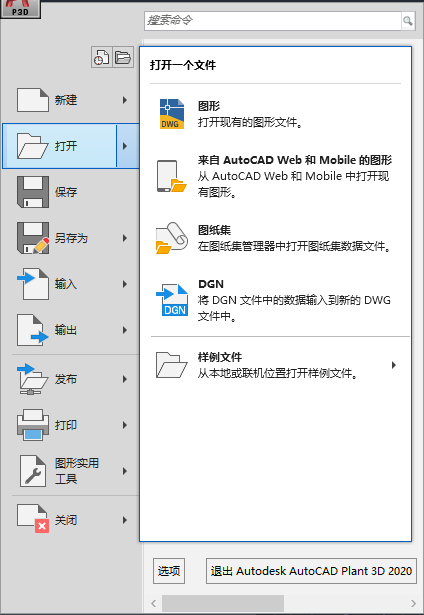 应用程序菜单位于程序的左上角,代替了早期版本的 AutoCAD Plant 3D toolset 中熟悉的传统菜单结构。
