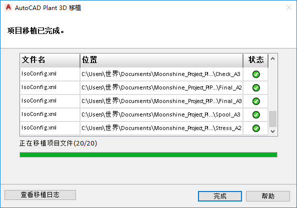 移植过程可能需要很长时间,具体取决于项目大小和关联的图形数。移植进度表格报告成功或失败的文件移植,并指明移植的进度。一旦所有文件成功移植,项目会在 AutoCAD Plant 3D toolset 中打开。