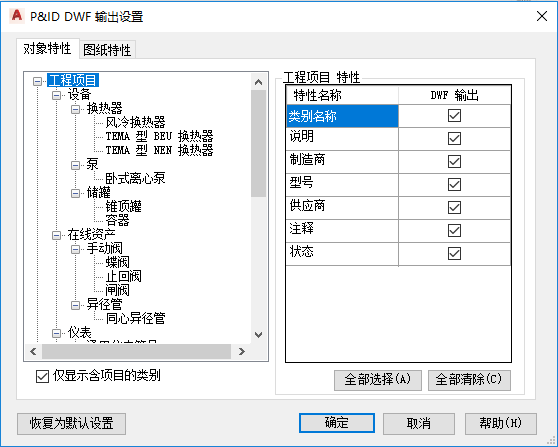 - 在“输出设置”对话框中的“对象特性”选项卡上,选中“仅显示含项目的类别”复选框。