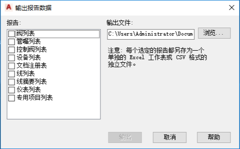 将选定报告输出为指定的文件名,输出到指定的文件夹。选择的每种报告类型显示在 Excel 电子表格中的单独工作表或存为单独的 CSV 文件。