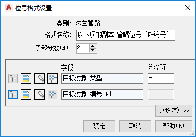 提示: 可根据需要使用任意多个特性作为子部分。分隔符只能用在这些子部分之间,而不能用在子部分内部。如果在“分隔符”框中放置分隔符,这些分隔符将显示在位号中各子部分之间。如果在“字段”框中的各项目间输入划线(例如 N-N-N),可能会产生意外的结果。