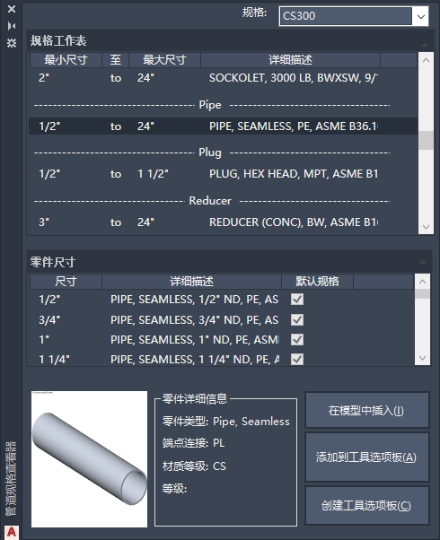 显示 AutoCAD Plant 3D toolset 中的当前等级库,并使您可打开并查看等级库工作表,将等级库工作表中的零件插入到模型中,以及修改工具选项板。