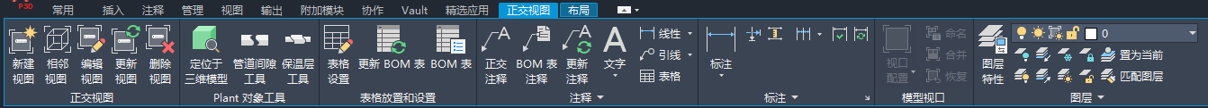 “正交视图”上下文选项卡是“三维管道”工作空间的一部分。
