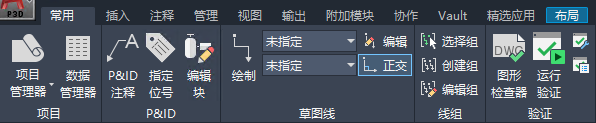 P&ID“常用”选项卡显示用于处理 P&ID 图形的选项。此选项卡包括以下面板:
