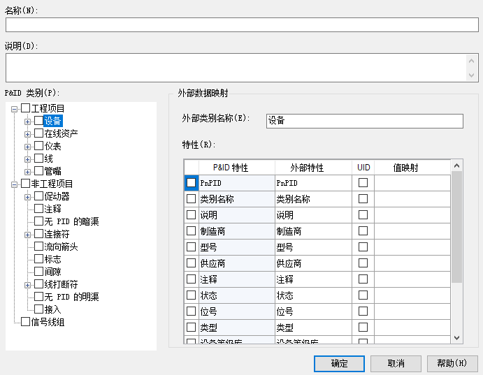 显示与 P&ID 特性等效的外部数据特性列表。默认情况下,外部特性名称与对应的 P&ID 特性名称相同。可根据需要更改外部特性。