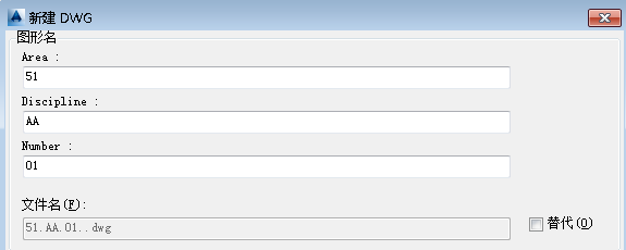 指定新文件名。如果已使用文件名格式创建了原始文件名,例如,结合了区域、规程和编号的格式(由分隔符分隔),“重命名 DWG”对话框将具有以下字段: