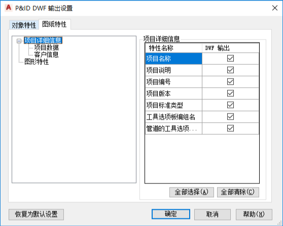 默认情况下,将包括“项目详细信息”和“图形特性”类别的所有特性。
