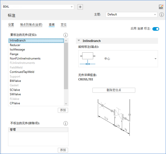 在“ISO 主题”列表中,选择要对其应用标注类型设置的 ISO 主题(默认管道或小孔管道)。