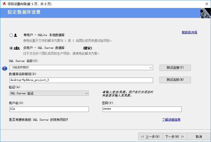 注: 项目设置向导包含一个页面,用于指定是否使用基于服务器的数据库以提高多用户性能和可靠性。如果要选择此选项,用户必须首先安装 Microsoft SQL Server Express 或 Microsoft SQL Server。