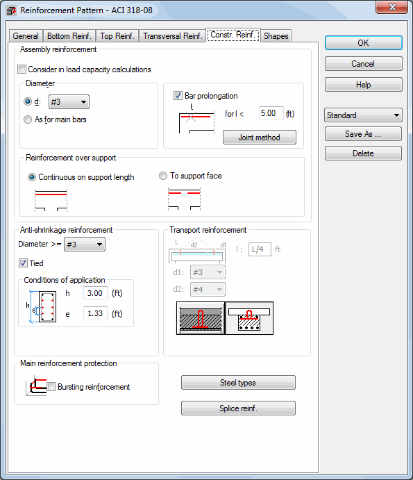 - Steel type as for longitudinal/ transversal reinforcement. This option allows determining a steel type for all structural reinforcement elements except transport reinforcement, for which a steel type is defined separately. If the Consideration of Load Capacity option is switched on for the assembly reinforcement, then there should be set an identical steel type as in case of longitudinal reinforcement. Otherwise, the calculations may be incorrect.