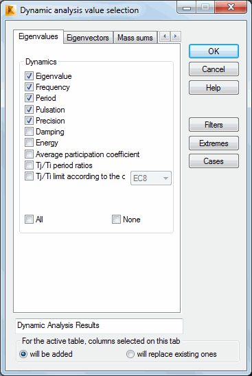 Select the Eigenvalues tab in the Table Columns dialog to select dynamic analysis quantities for presentation.