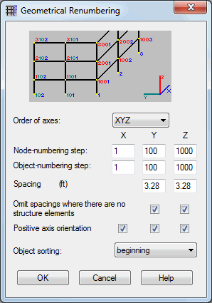 This option specifies the parameters for geometrical renumbering. Open the Geometrical Renumbering dialog, by clicking Parameters in the Numbering dialog, after you select the Geometrical numbering option.