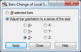 - Adjust bar orientation to a sense of the axis - activates the options in the bottom part of the dialog. If one of them is chosen, then the sense of the local x axis of the selected bars is changed. For example, when Z+ is selected, the x axis of the bar local coordinate system will be pointed upwards consistently with the sense of the Z axis of the global coordinate system.
