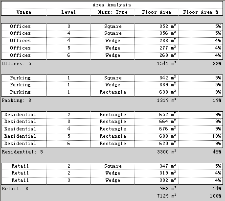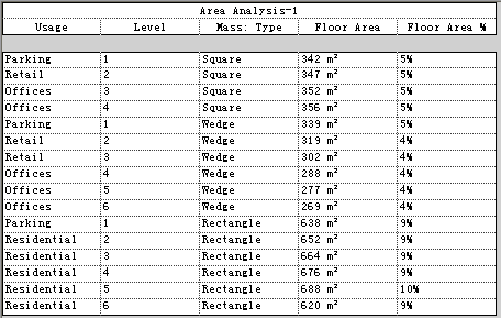 创建明细表以对概念设计中的体量执行面积分析。根据您要在明细表中显示的信息的不同,具体步骤会有所不同。