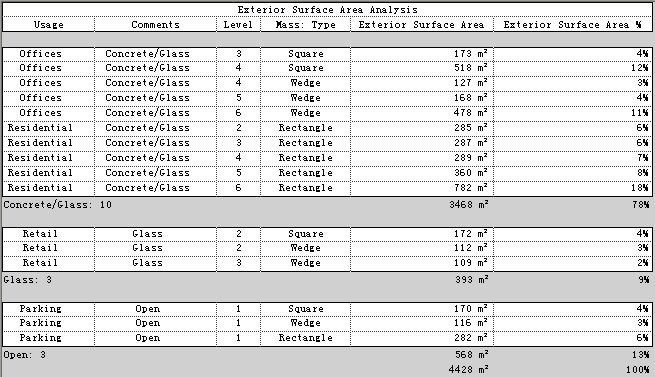 在本示例中,有些体量楼层(例如 Square Level 4 和 Wedge Level 6)的外表面积比其他体量楼层的外表面积大,这是因为它们的计算范围不同。