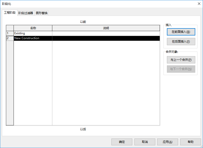 “阶段化”对话框将打开,其中显示“工程阶段”选项卡。 默认情况下,每个工程都有称为“现有构造”和“新构造”的阶段。