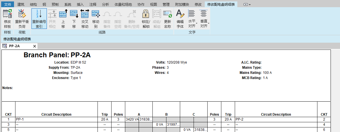 显示配电盘明细表时,可以在配电盘上重新排列线路,如将线路上移、下移、左移、右移、分组或锁定在某处。而且,还可以平衡各相位间的负荷、指定备件和空间,以及更新线路名称。