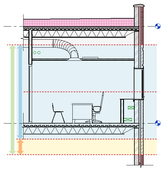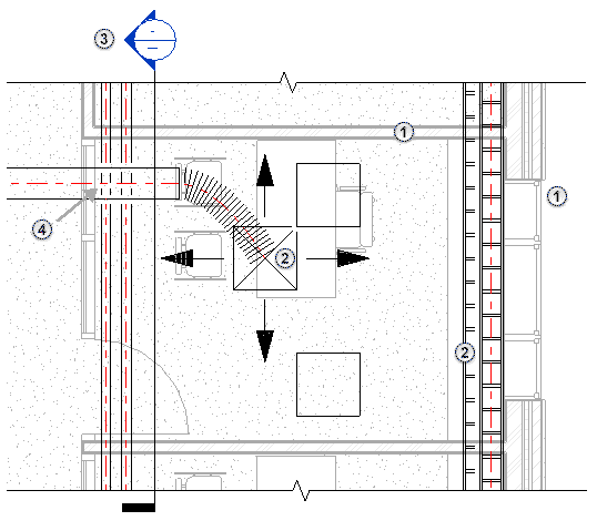 下面的示例基于一个模型的标高 1 剖面平面。 在该剖面平面中,绿色箭头指示对应平面视图的整个视图范围。 蓝色箭头指示主视图范围,该范围已扩展到高于天花板进入正压送风系统,并低于标高 1。 橙色箭头指示视图深度。 (请参见关于视图范围。) 在下面示例平面视图中,“详细程度”被设置为“精细”,以便更充分地显示机械、电气和管道图元,从而方便说明。