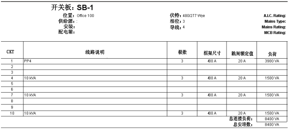 具有一个回路列的开关板配电盘明细表