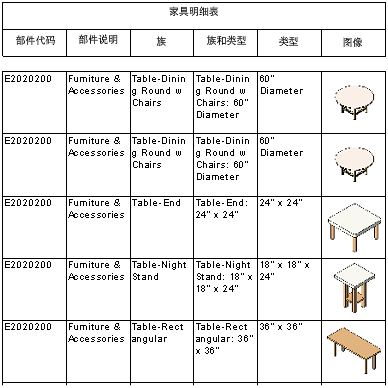 可与图元相关联的图像包含导入到模型的图像,以及通过将模型视图(例如三维或渲染视图)保存到项目所创建的图像。 如果包含在明细表定义中,图像会显示在图纸上放置的明细表视口中。 明细表视图本身包含图像名称,而不是图像。 以下示例显示了图纸上带图像的家具明细表。