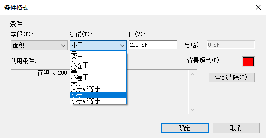 例如,使用条件格式包括设置某一条件来指明其平方英尺值小于指定最小值的面积,或供给模型中的每一房间的送风量是否正确。