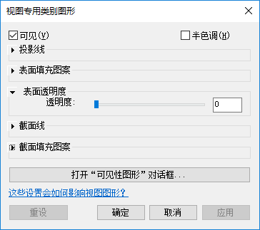 “视图专有类别图形”对话框显示所选类别的当前可见性和图形显示设置。展开每个区域以查看其设置。