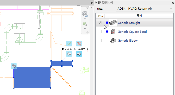 “MEP 预制构件”选项板显示可用解决方案中使用的所有构件。蓝点指示当前选定解决方案中使用的构件。将光标置于列表中的某个构件上时,该构件将在图形区域中亮显。在“MEP 预制构件”选项板中,选择复选框以过滤可用管件列表和限制解决方案数量。