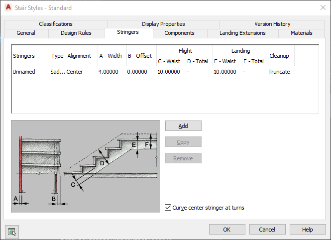 With the Curve center stringers at turns option cleared, the center stringer is mitered to match the angle of the landing turn. In most cases, this will be a right angle, but any other angle is also possible.