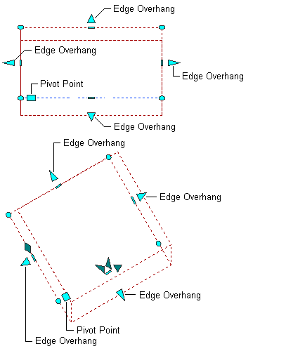 The types of editing grips available for a selected slab or roof slab depend on the view direction. As shown in the following illustrations, Edge, Edge Overhang, Vertex, and Pivot Point grips are displayed in both plan and three-dimensional (3D) isometric views. Angle, Vertical Offset, Horizontal Offset, and Thickness grips are available only in 3D isometric views.