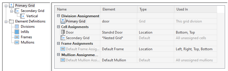 Each grid has its own cell assignments. You assign cells to contain another grid, a panel infill, or an object such as a door or window.